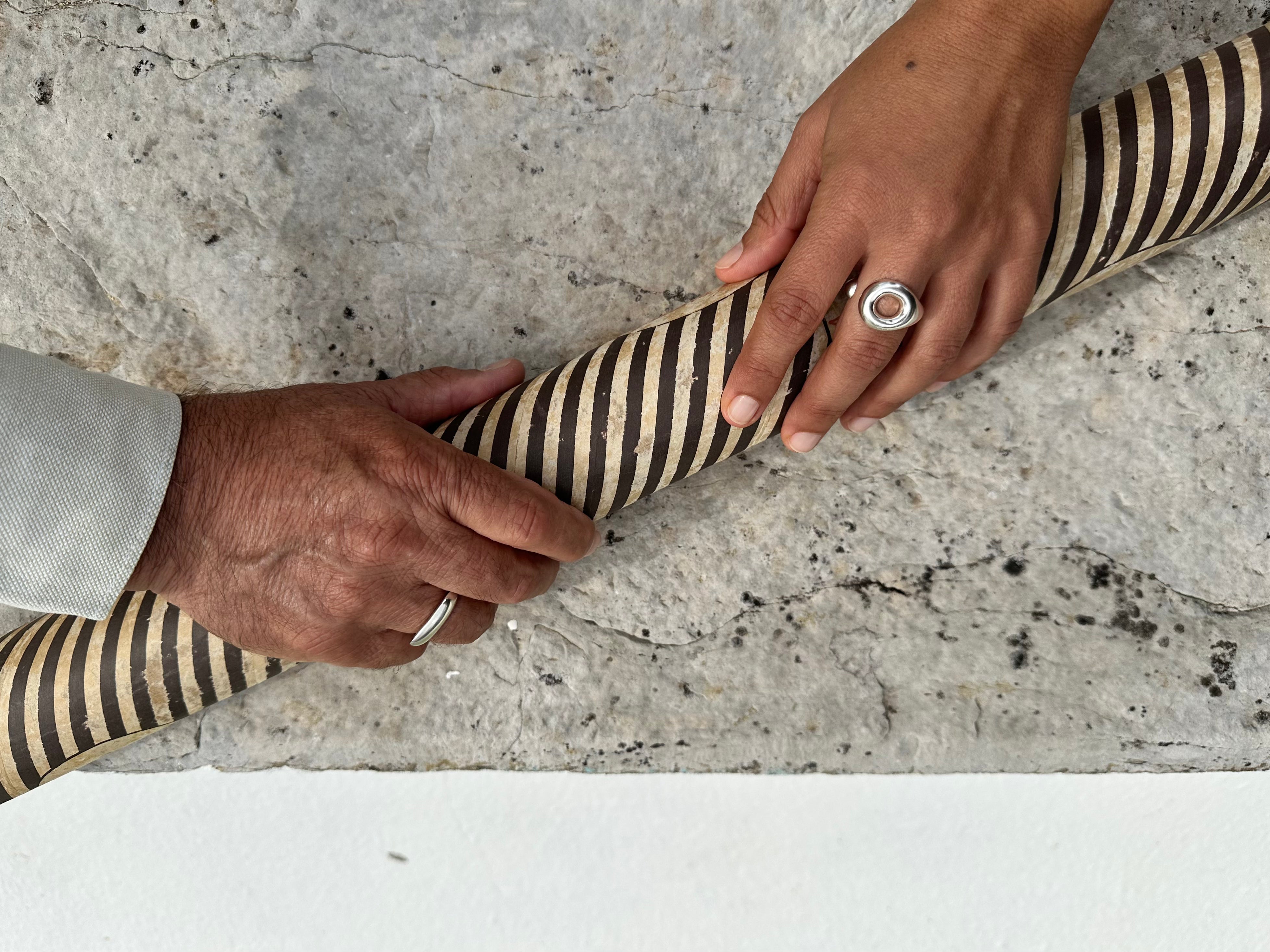 Na oficina a música de fundo funde-se com os gestos lentos e ritmados do trabalho artesanal. Inês preserva o amor pelas técnicas tradicionais e as ferramentas antigas estão espalhadas pelas paredes onde se encontram pedaços de memórias de outros lugares, sementes, seixos, fósseis e esqueletos de folhas e flores prensadas.