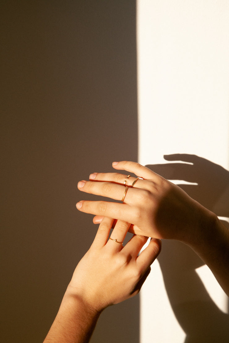 Entre força e delicadeza, estes anéis exaltam o corpo como lugar de encontro entre o humano e o poético.