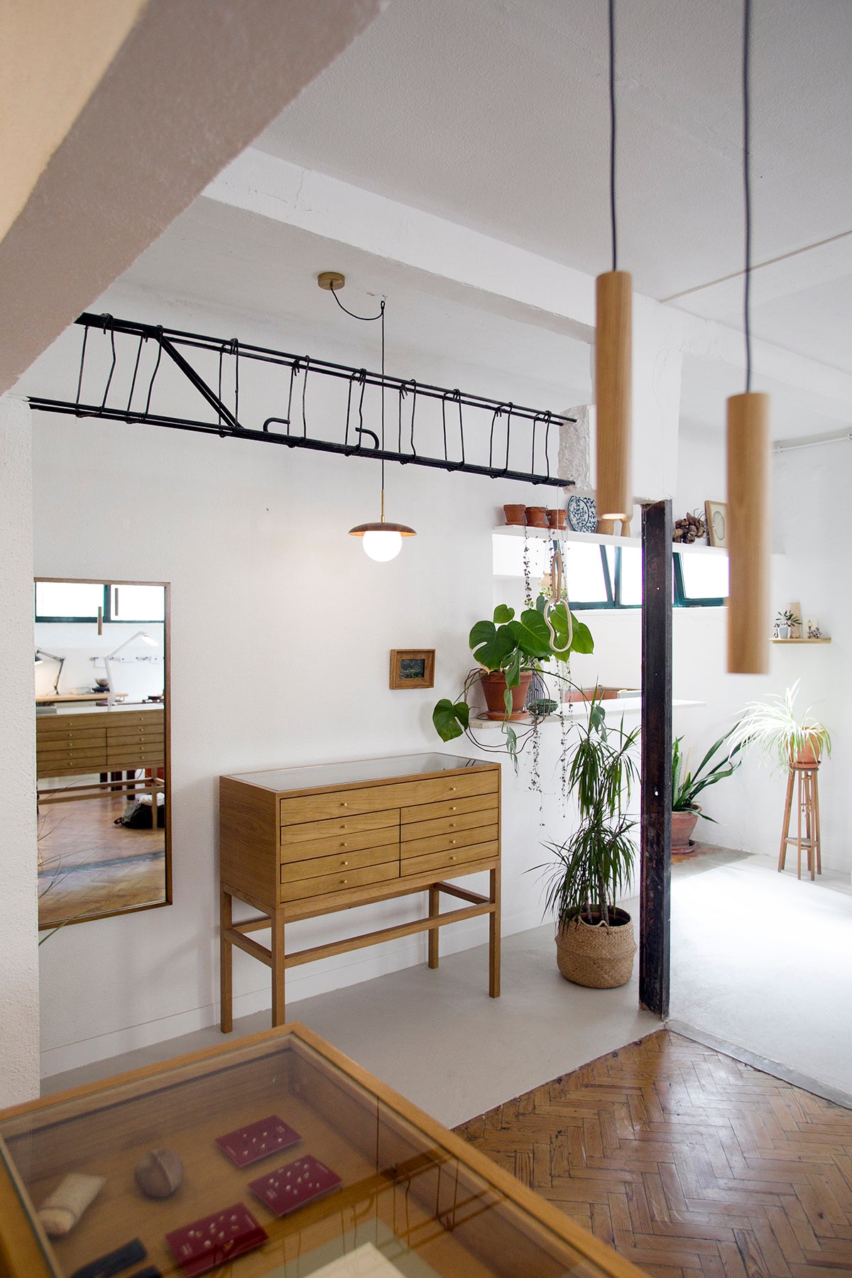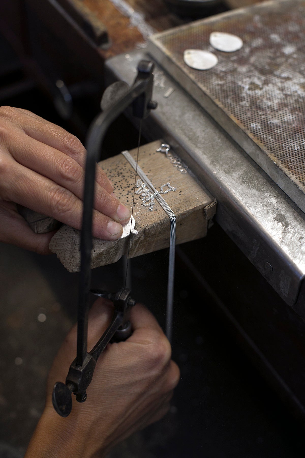 Na oficina a música de fundo funde-se com os gestos lentos e ritmados do trabalho artesanal. Inês preserva o amor pelas técnicas tradicionais e as ferramentas antigas estão espalhadas pelas paredes onde se encontram pedaços de memórias de outros lugares, sementes, seixos, fósseis e esqueletos de folhas e flores prensadas.